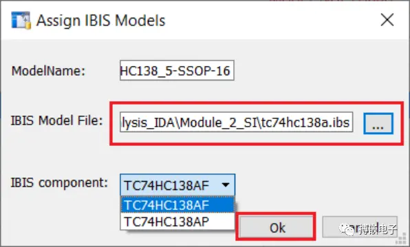 选择 Browse Model 按钮下的 IBIS Model Browsing 选项。在打开的“分配 IBIS 模型”对话框中,单击“...”按钮以打开文件浏览器并选择测试用例中的 tc74hc138a.ibs 文件。IBIS 组件下拉列表列出了文件中存在的 [component] 模型。选择任一组件模型,然后单击“确定”。
