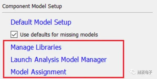4.选择 Analysis Workflows 窗格的 Component Model Setup 部分下的 Default Model Setup 链接。这将打开“Default Model Setup”对话框,该对话框用于在没有为模拟中的引脚找到缓冲模型并且仅当在工作流中启用“Use defaults for missing models”复选框时选择要在模拟中使用的默认模型。