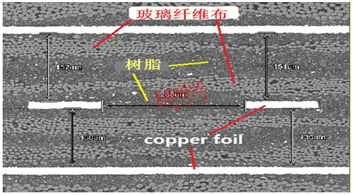 大家肯定或多或少听过不同类型的PP,例如1080,2116,3313,7628等。但是不知道它们具体有什么区别,这里高速先生给大家稍微深入的普及下哈。下图的PCB切片就可以看到,PCB介质(无论是core还是PP片)都是由两部分组成的,包括了玻璃纤维布和树脂。其中玻璃纤维布就像骨架,起增加强度和支持的作用,树脂就像胶水,起到粘合的效果。