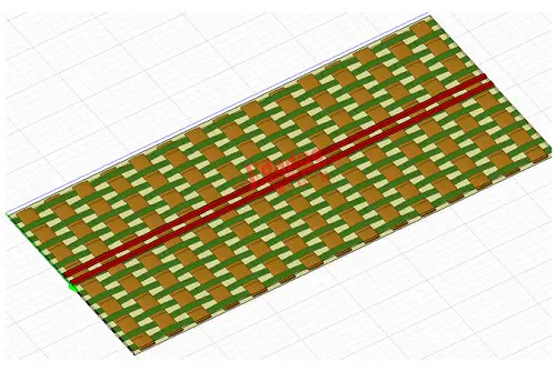 那到底走线在PP上的不同位置会对阻抗有多大差异呢?其实这个事情从仿真和测试都很难用数据去量化,因为走线在哪个位置本来就是一件随机的事情,因此很难得到具体阻抗偏差的范围,高速先生尝试在cadence的3D仿真软件中按照IPC协会对玻纤布的详细规格建出一个3D的玻纤布模型,建的是比较差的1080PP模型,如下所示: