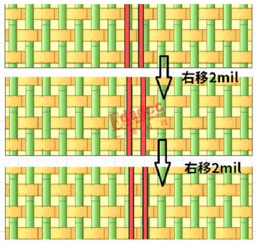 从模型上可以看到,1080的PP玻纤布的开窗是比较大的,我们在上面建了一对理想情况下接近100欧姆的差分线,然后我们通过扫描它在PP上的不同位置仿真得到各自的阻抗,按照走线往右移动每隔2mil的情况进行扫描,大概仿真6个case,如下所示: