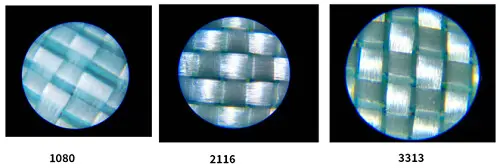 然后根据单位长度有不同数量玻纤束的编织方式,就形成了窗口大小不同的玻纤布类型,下图是高速先生在“自制”的显微镜下在实物板上看到的不同玻纤布的图像: