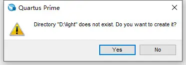 2. 选择工作文件夹introtutorial,也可以使用您自己设定的文件夹。工程必须有一个名字,通常情况下,与顶层设计实体的名字相同。如图5所示,选择light作为工程名和顶层实体名。单击Next。因为还没有创建introtutorial文件夹,Quartus prime弹出一个对话框,询问是否新建所需文件夹,如图6所示。单击Yes,将会引出图7所示的窗口。