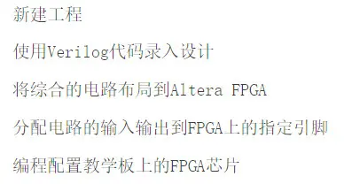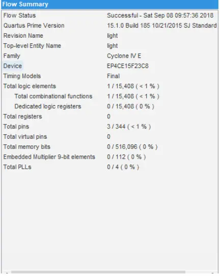 在light.v中Verilog代码,要经过几个Quartus prime工具的处理:分析代码、综合电路以及生成目标芯片的实现内容。这些应用程序被聚集在一起,且被称作编译器。