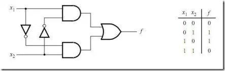 作为一个设计范例,我们将采用双路的灯控电路,如图 60所示。此灯可由两个按键中的任一按键来控制,x1和x2,按键按下的为0。真值表也同时在图中给出。注意输入x1和x2是异或的关系,但是我们仍然用门来显示。
