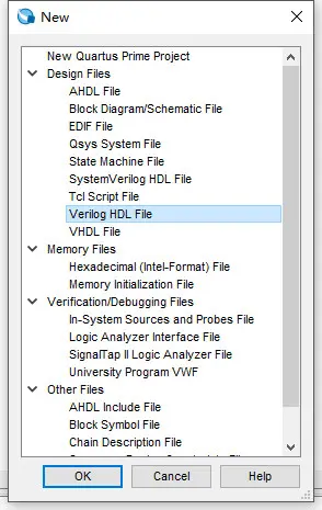 本节将展示如何使用Quartus prime文本编辑器。如果你喜欢使用其他文本编辑器来创建Verilog源文件,可以逃过此节。选择File>New打开图14所示窗口,选择 Verilog HDL File,并单击OK。这将打开文本编辑器窗口。第一步是指定所创建的文件的名称。选择File>Save As,打开图15所示的对话框。选择存储类型为Verilog HDL File,填写名称为light.v。单击Save,打开图16所示窗口。输入图13所示的代码。使用Ctrl+s保存该文件。
