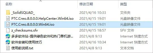 1、下载解压,得到ptc creo 8.0中文原程序和_SolidSQUAD_文件;
