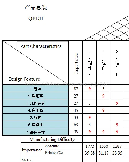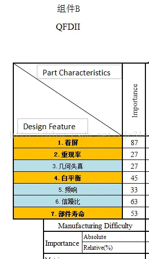 在完成产品总装的QFDII后,可以从表上看出,组件B的设计要求为:1.着屏;2.重现率;4.白平衡;7.部件寿命;