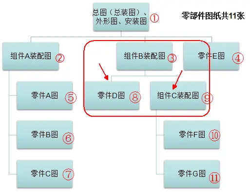 仍就以上图为例子,那么组件B装配零部件为:零件D,组件C。