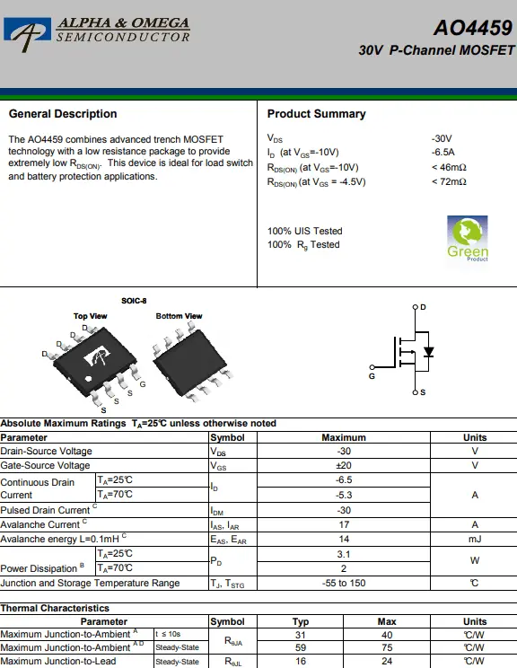 图中右方:万国AOS(Alpha & Omega Semiconductor)的30V P-Channel AO4459功率器件。该器件将先进的沟槽MOSFET技术与低电阻封装技术相结合,提供极低的RDS(ON)装置,是负载开关的理想设备,能够适合电池保护的应用。