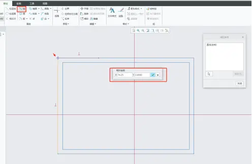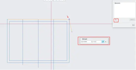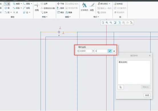 10、用同样的方法绘制上下的分区线,选择右上角作为线条起点端后——鼠标右键选择相对参考——Y坐标输入-52.5