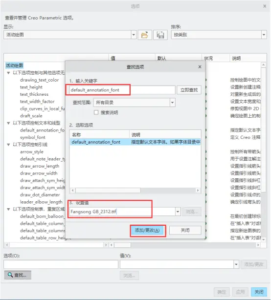 3、设置工程图配置文件Metric_GB.dtl选项default_annotation_font值为Fangsong GB_2312.ttf