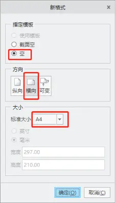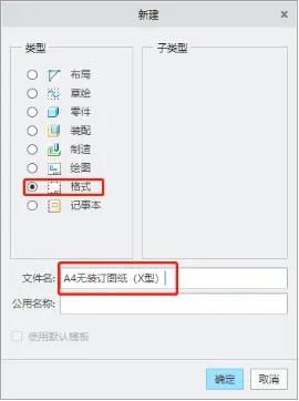 步骤1、新建——进入格式模块输入文件名称“A4无装订图纸(X型)”——标准大小改为A4——点击确认