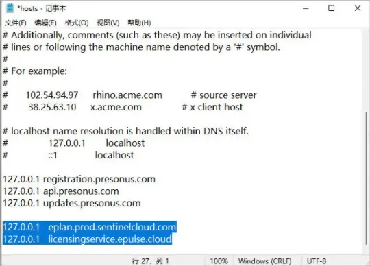 1、将以下内容添加到系统hosts文件中,并保存; 127.0.0.1 eplan.prod.sentinelcloud.com 127.0.0.1 licensingservice.epulse.cloud C:\Windows\System32\drivers\etc