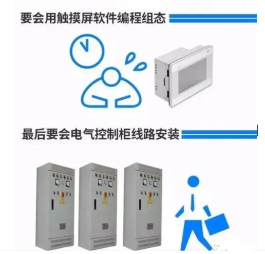 4、电气控制柜线路安装:向真正的电气工程师的岗位迈进,需要具备前面三项基本能力。新人刚进入厂时,不知道如何入手了解设备控制原理,PLC编程不熟练,网上查个元件型号查不到,电气图纸也看了大半个月也看不懂,这样,就会出现,一年、甚至半年就想换个工作环境。所以要从事工控行业,就要坚定自己的选择,“找对路,下对药”,趁着年轻对自己狠一点。
