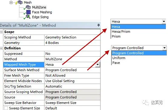 1、扫掠划分(Sweep Meshing) 2、六面体支配(Hex Dominant) 3、多区(Multizone Meshing)