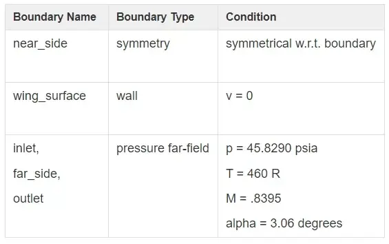 Onera M6 机翼上的气流是跨音速和可压缩的。翼流经历超音速条件、激波和边界层分离。没有机翼扭曲,所有弦都在同一平面上。因此,攻角就是自由流与弦线之间的夹角。模拟中没有侧滑。下面给出了流动条件