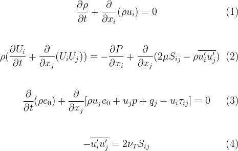 我们的模拟受连续性、Navier-Stokes(动量守恒)和能量方程的约束,但由于这是湍流,我们将使用这些方程的雷诺平均版本。我们还将使用 Spalart-Allmaras 湍流模型来封闭雷诺平均方程组。Spalart-Allmaras 湍流模型是为受壁面限制和逆压梯度影响的航空航天应用而开发的。Spalart-Allmaras 模型只有一个求解运动涡流粘度的方程。我们需要解决我们网格所有单元中心的问题变量。总的来说,我们有六个变量需要求解:速度、压力、温度和运动涡流粘度这 3 个分量。下面给出方程式。