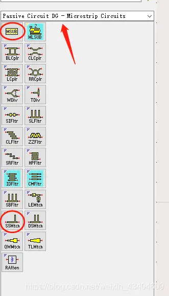 2、在原理图的器件面板列表选择“Passive Circuit DG - Microstrip Circuits”,在该列表下面选择"SSMtch",并且需要选择元器件“MSUB”,设置微带线基板相关参数。