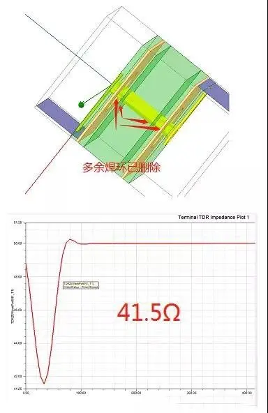 将两个结果进行对比,可以看到采用无盘工艺后过孔阻抗由37.5提升到了41.5,更接近传输线阻抗50Ω,因此会有更小的反射,更好的信号质量。