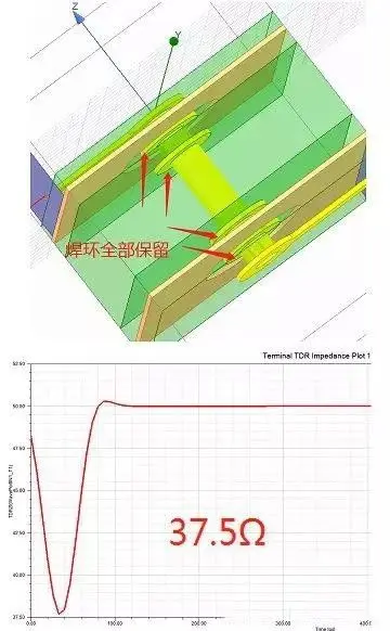 由于过孔的特性,通常过孔的阻抗都是小于我们传输线阻抗50Ω的,当传输线阻抗与过孔阻抗不匹配,就会产生反射,导致我们S参数中看到的损耗增加。