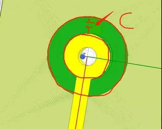这是一个正常的过孔,钻孔、过孔焊环、反焊盘....拥有标准过孔的一切,相信大家已经熟悉的不能再熟悉。 过孔的贯通孔用于连接PCB的各层,而孔的焊环则负责将信号引出。周围的铜皮对于非相同网络过孔的避让距离就是反焊盘。