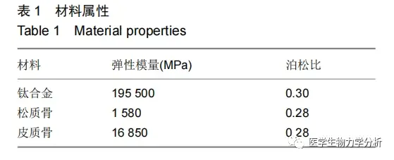 1.5.7 机械特性设置 股骨头松质骨的弹性模量分别为850 MPa,股骨头松质骨的泊松比设置为0.3,股骨颈松质骨的弹性模量分别为630 MPa,股骨颈松质骨的泊松比都设置为0.30,股骨转子间松质骨的弹性模量分别为270 MPa,股骨转子间松质骨的泊松比都设置为0.3。股骨皮质骨的弹性模量分别为17 000 MPa,股骨皮质骨的泊松比都设置为0.3,钛合金的弹性模量分别为110 000 MPa,钛合金的泊松比都设置为0.35,不锈钢的弹性模量分别为185 000 MPa,不锈钢的泊松比都设置为0.3。