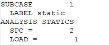 如上图所示,该Subcase的编号为1,标签为static(该标签会显示在后处理中),分析类型为静力分析,其中引用了编号为2的spc约束和编号为1的load载荷。