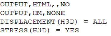 如上图所示为I/O部分,第一行和第二行指定了不输出html和hm的格式文件,目的是为了减少不必要的文件输出。第三行和第四行分别指定了输出所有节点的位移和所有单元的应力,以.h3d格式文件输出。I/O部分还可以指定其他的输出类型,如应变、加速度等,也可以指定其他的输出格式,如output2和punch等格式。