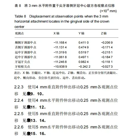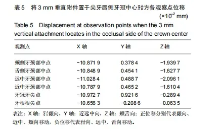 2.2 结果分析实验主要以牙齿牙合方、龈方为位置差异,3,4,5 mm高度为尺寸差异,比较附件大小、放置位置、放置方向对牙齿伸长的效果差异。由于数据过于庞大且具有相似性,故以3 mm垂直为主具体展示。