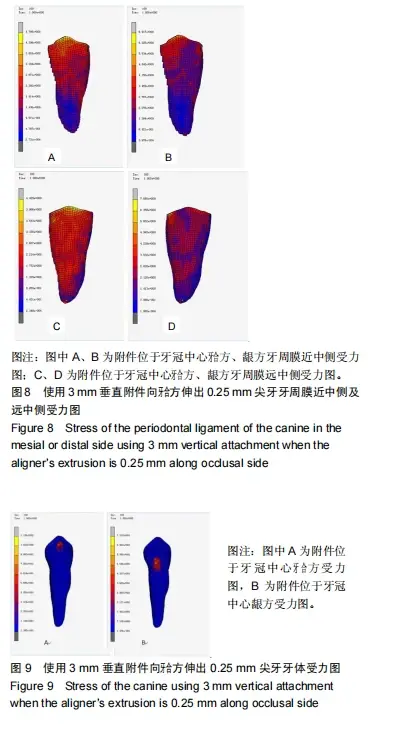 方法:利用离体尖牙扫描数据建立矫治器-附件-尖牙-牙周膜-松质骨-皮质骨的三维仿真实体模型,其中附件设置不同的方向(垂直、水平)、尺寸(高度 3,4,5 mm)与位置(唇侧牙冠中心牙合方、唇侧牙冠中心龈方),加载牙合向 0.25 mm 强迫位移,观察牙体、牙周膜的形变及等效应力。