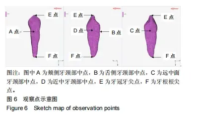1.5 主要观察指标观察牙体及牙周膜所受等效应力,另将牙体选颊侧牙颈部中点、舌侧牙颈部中点、远中面牙颈部中点、近中牙颈部中点、牙冠牙尖点、牙根根尖点作为观察点,观察各点在坐标轴的初始位移,见图6。