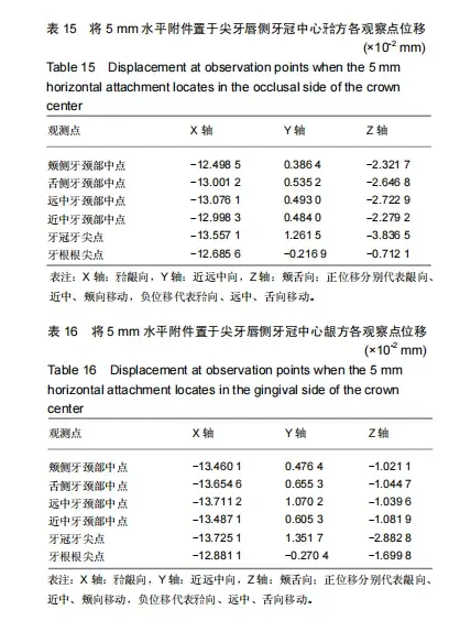 3.3 水平、垂直附件比较由上述讨论可知,伸长运动包含牙体受到矫治器、牙周纤维组织等合力的综合表现运动。所以在伸长运动中牙齿受力更均匀时,可最大程度上减少不必要的倾斜与扭转运动。比较水平附件和垂直附件各位移点距离图发现,牙齿在匹配垂直附件情况下X轴各位移点距离比水平附件大,表明水平附件情况下牙齿伸长效果反而优于垂直附件。这是由于在牙体受力图中,垂直附件增大牙齿受力主要表现在附件牙合方,所以它主要增大唇侧牙齿牙合方受力,在舌侧受力一定时,唇侧牙合方受力增加,势必会加剧牙齿唇舌侧受力不平衡,受力更多用于倾斜运动。水平附件水平向尺寸大于垂直附件,所以其增加的受力更均匀地分布在以牙长轴为轴对称的近远中方向,较垂直附件更加均匀,受力更多用于伸长运动。
