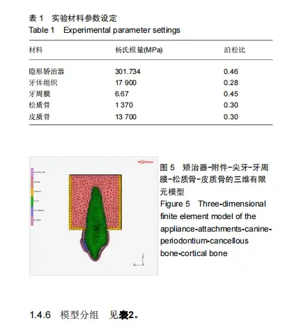 将已完成网格划分的隐形矫治器、附件-尖牙、牙周膜、上颌牙槽骨的模型导入MSC.Marc.Mentat 2016软件中,进行各种材料的参数设定,见表1。建立矫治器-附件-矫治器-尖牙-牙周膜-松质骨-皮质骨的三维有限元模型,见图5。