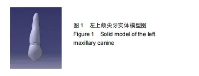1.4.1 牙体、牙周、无托槽隐形矫治器的重建从20例隐适美的扫描模型中挑选出符合标准形态的尖牙模型,通过3D打印出来以后,再扫描3D模型得到DICOM文件,患者对实验知情同意。将扫描离体尖牙后得到的DICOM文件导入软件Mimics17.0,进行三维重建生成的初步实体模型,并保存为STL格式。再将其导入Geomagic Studio 2015中进行模型修复和简化,调整牙冠表面平整度,使模型更加光滑,以减少后期计算误差,同时以STP格式输出模型[9],见图1。