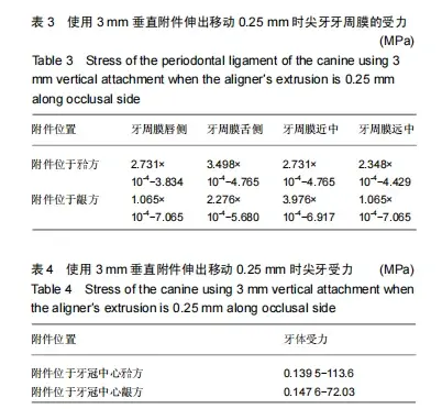2.2.1 使用3 mm垂直附件伸出移动0.25 mm尖牙牙体与牙周膜受力见表3,4。牙周膜与牙体受力云图,见图7-9。