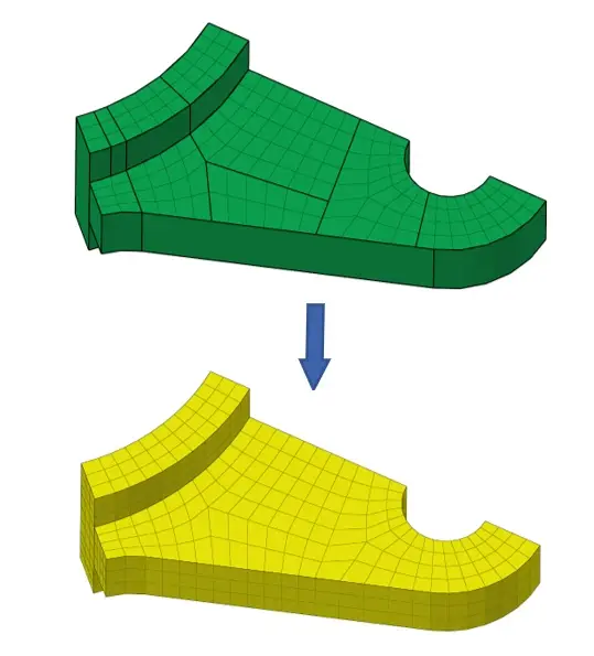 a.首先在此区域的端面上进行面的分割,然后再进行2d网格的生成,对于三角形区域可以使用三角形映射的方式来划分出比较好的网格。