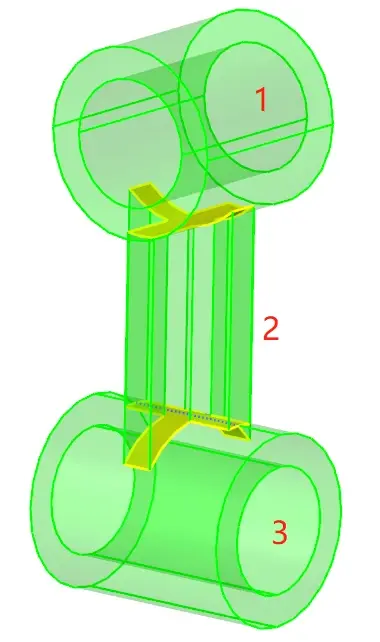 下端区域3和上端区域1的网格划分方法一样,只是在进行三维网格生成前需要抽取十字面的网格,和外圆柱面上生成的二维网格共同作为扫掠的源面网格,向内侧圆孔面进行扫掠生成三维网格。划分完成后使用“edges”命令对整体网格模型做共节点,这里节点容差可以设置成0.1mm。见图5所示。