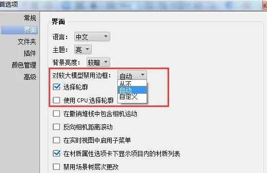 4、对较大模型禁用边框,设置为:自动。 在编辑 > 首选项 > 界面对话框中进行设置,然后点击保存更改,如果模型特别大,这么做可以关闭模型周围的橙色边框。