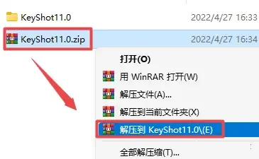 1.选中下载的压缩包,然后鼠标右键选择解压到"keyshot11"。