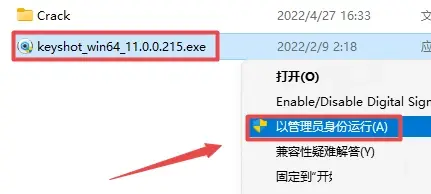 2.打开刚刚解压的文件夹,找到并选中"keyshot_win64_11.0.0.215.exe”,鼠标右键点击"以管理员身份运行”。