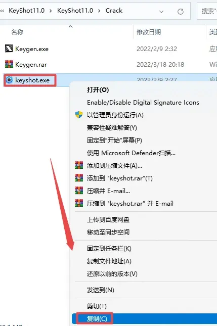 10.返回之前解压后的"keyshot11"文件夹,双击打开"Crack”文件夹,选中"keyshot.exe”文件,鼠标右键点击"复制”。