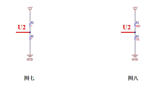 因为R3在比较器输出高或低的时候作为上下拉电阻,我们在计算时候先忽略R3、R4支路,然后比较器输出高的等效电路就可以改为图七,此时电源电压5V,保持电路1mA电流可以确定R5+R2等于5K上下,然后进行电阻分配,R5=1K,R2=4K3图八示(电阻取值不唯一,其他阻值也是可以的)