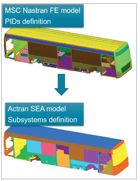 使用MSC Nastran提取的结构和声学模态创建巴士完整的声振耦合SEA模型。在Actran图形界面中根据有限元单元属性号和结构的材料以及形状划分子系统,用来创建统计能量矩阵。