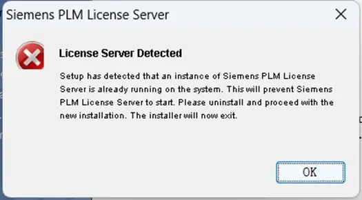 Setup has detected that an instance of Siemens PL LicenseSerer is already running on the system. This will prevent SiemensPLM License Serer to start. Please uninstall and proceed with thenew installation. The installer will now exit.