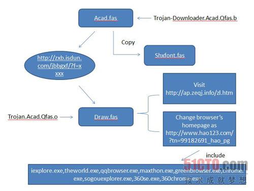 1. Trojan-Downloader.Acad.Qfas.b下载Trojan.Acad.Qfas.o。它通常被命名为acad.fas并打包进许多建筑制图压缩包中诱使相关用户下载运行。当AutoCAD执行这个文件,它会将自身复制为shxfont.fas并从http://***.isdun.com/jbbgxf/?f=zydz下载Trojan.Acad.Qfas.o。
