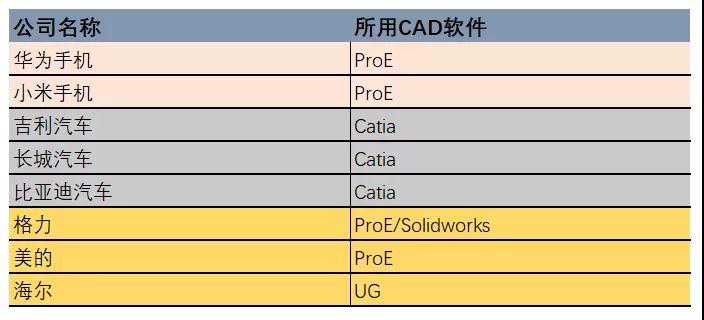 我还以汽车行业为例说明,国产汽车行业中,以长城、比亚迪等汽车厂家均以使用Catia为主,这主要是Catia在所有三维设计软件中曲面造型功能是最强大的,而往往汽车车身造型设计对这块要求很高,而消费电子领域,以使用Proe为主,目前知名研发类企业中,很少见到国产三维CAD软件。