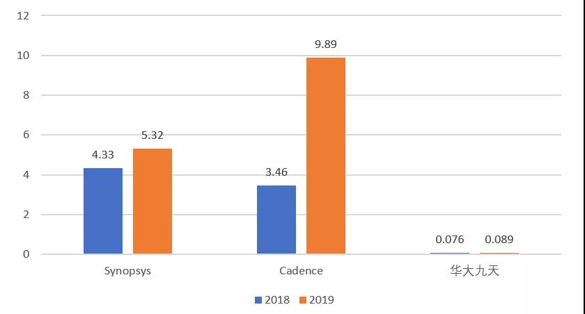 我们再对比一下这三巨头与华大九天在2018-2019两年的净利润,由于Mentor被西门子所收购,财务报表不单独公开,我只拿出Synopsys、Cadence的数据与华大九天进行对比