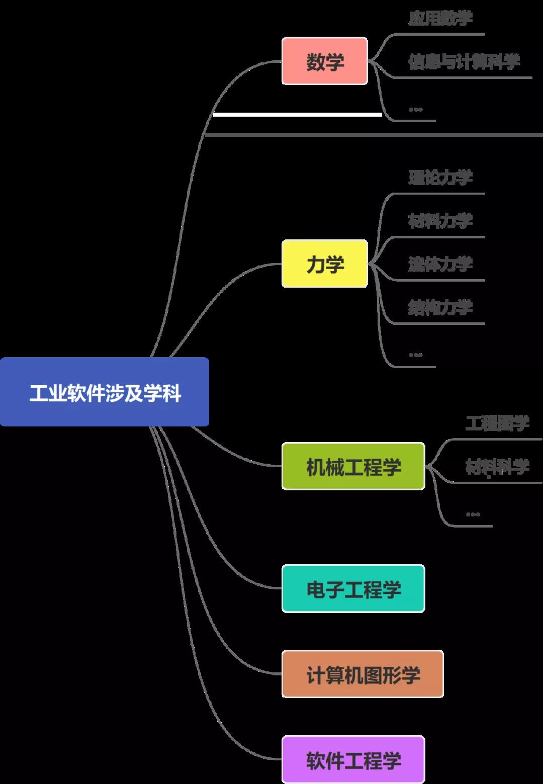 说道这里本文就算结束了,我写这两篇文章的主要目的在于希望能够让大家认识到工业软件的重要性,同时如果能激发一些小伙伴对工业软件的兴趣并投身于这个行业,哪怕只有一个,我就非常心满意足了。还有,我也真心希望通过这两篇文章能够引起国家工信部门等相关人员对工业软件行业的关注,希望国家加大对工业软件行业的扶持力度,发挥我们国家制度的宏观调控优势,提高从事开发工业软件领域人才的待遇,毕竟要攻克卡脖子关键领域问题不能光靠情怀,还得多少加点面包。对了,上篇文章中有小伙伴问我如果想投身于工业软件这个领域,具体应该学什么专业?我还是那句话,工业软件不是IT的产物,它是一个交叉学科,如果你想投身于这个行业,计算机专业知识当然必可少,但最重要的是要把数学、力学、电学等这些基础课程给学好,我这里列举了工业软件涉及到的学科,供大家参考一下。