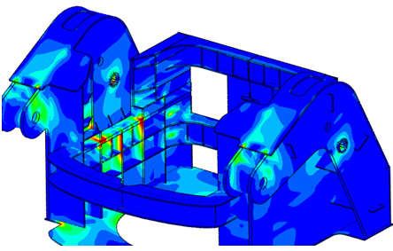 钢包主结构的横梁H1、H2、H3和H4以及立柱V1、V2和V3,在各自的调整范围内进行调整,结构件H1、H2、V1、V2和V3是发生应力集中的地方,在5倍安全系数的载荷工况下,都存在明显的潜在失效破坏的危险。
